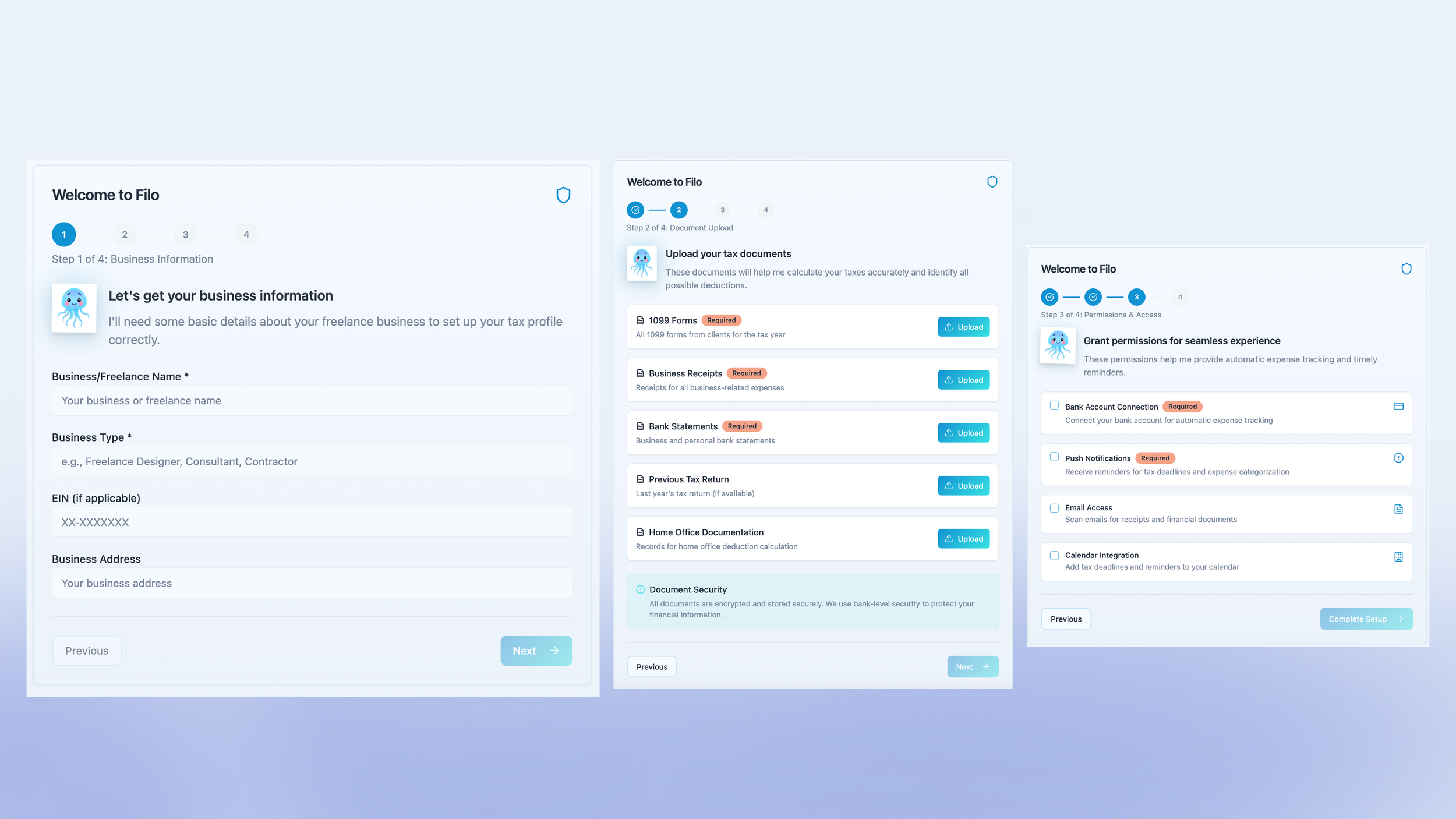 Filo’s onboarding feels conversational, not transactional. The assistant helps freelancers set up their