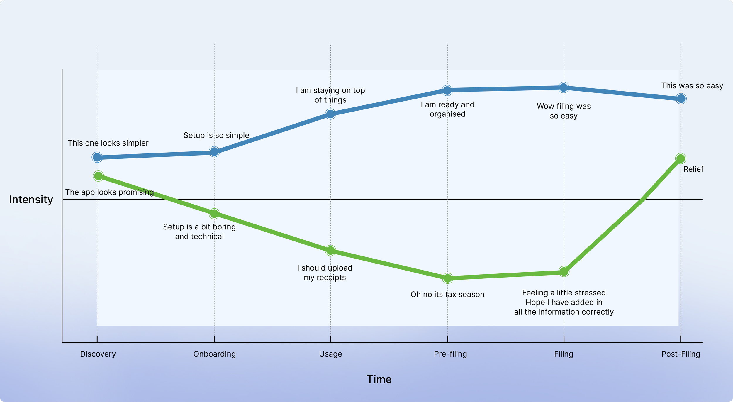 The green line reflects the traditional tax experience — full of stress, technical setup, and uncertainty